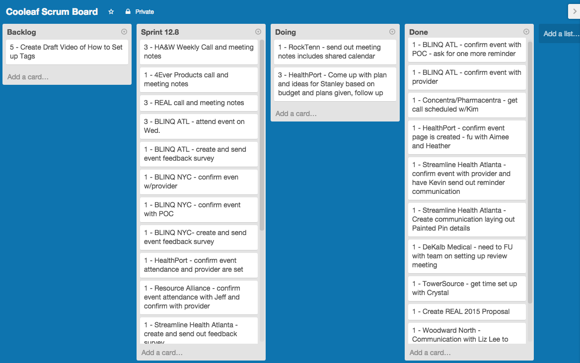 The success that Tami had with using an Agile Methodology for her marketing team inspired me to adopt this process for our team at Cooleaf. I decided to impelment this process for our team to manage the Account Management work that we do on a weekly basis. Our Sprint is summarized in the picture below. We just started using this process so I will write a post in the future about our results and lessons learned. I do believe that Agile can be used beyond development teams and I’m looking forward to seeing what we can do.